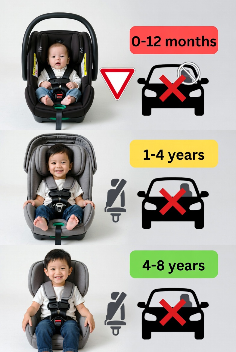 Infants (birth to 2 years): Rear-facing is non-negotiable for spinal protection. A child's head is 25% of their body weight (vs. 6% in adults); forward-facing crashes exert forces their necks cannot withstand. Keep them rear-facing until they hit the seat's maximum height/weight—often age 3–4 in modern seats. Never place rear-facing seats in front of active airbags.